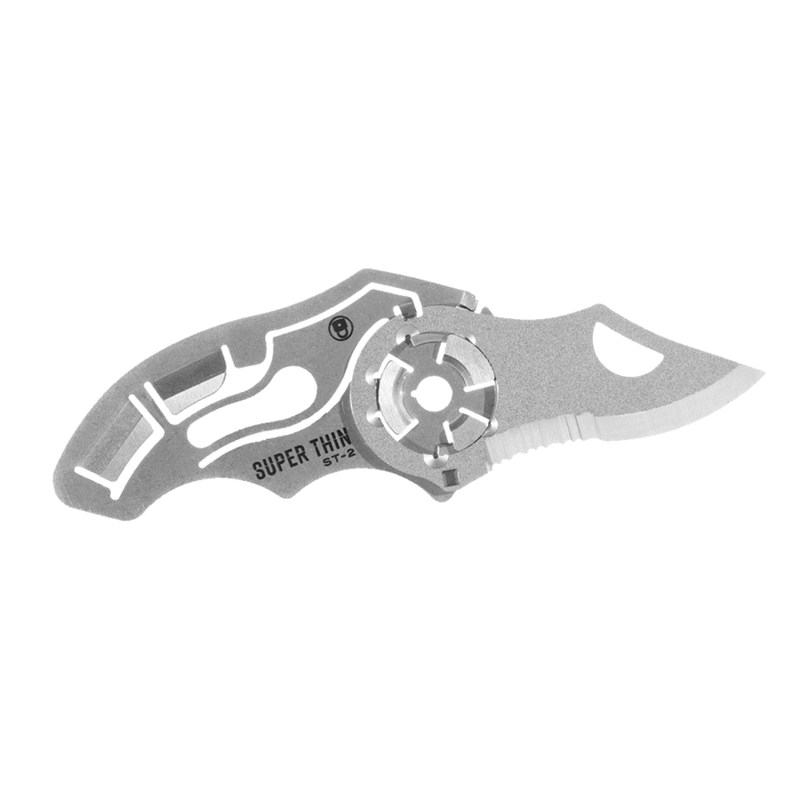 ST-2 is a Super Thin 440C stainless steel folding pocket knife with dual blade guards. Under all circumstances, the ST-2 is convenient to store and carry due to it's ultra-thin featherweight design and patented FlyOff technology.