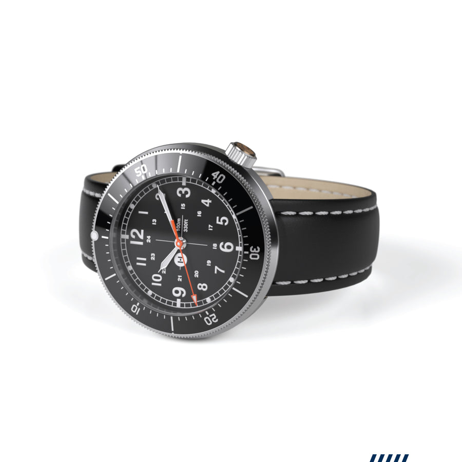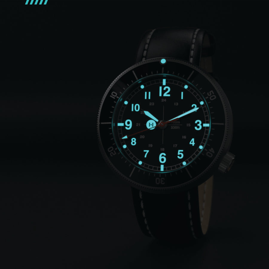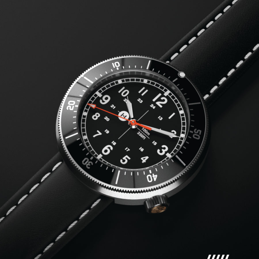 • Movement: Seiko VH31 (sweep seconds hand, ticking four times per second / 4 Hz, 2 jewels)• Case: 316L stainless steel, brushed & polished, no lug puck design• Case Width: 40 mm• Case Thickness: 11 mm• Strap Width: 20 mm• Caseback: Screwdown, engraved• Dial: Flat w/BGW9 lume• Front Crystal: Flat sapphire w/AR coating• Water Resistance: 100 meters• Crown: Signed• Bezel: Rotating, 120 click, floating lumed pip• Strap: leather w/signed buckle -